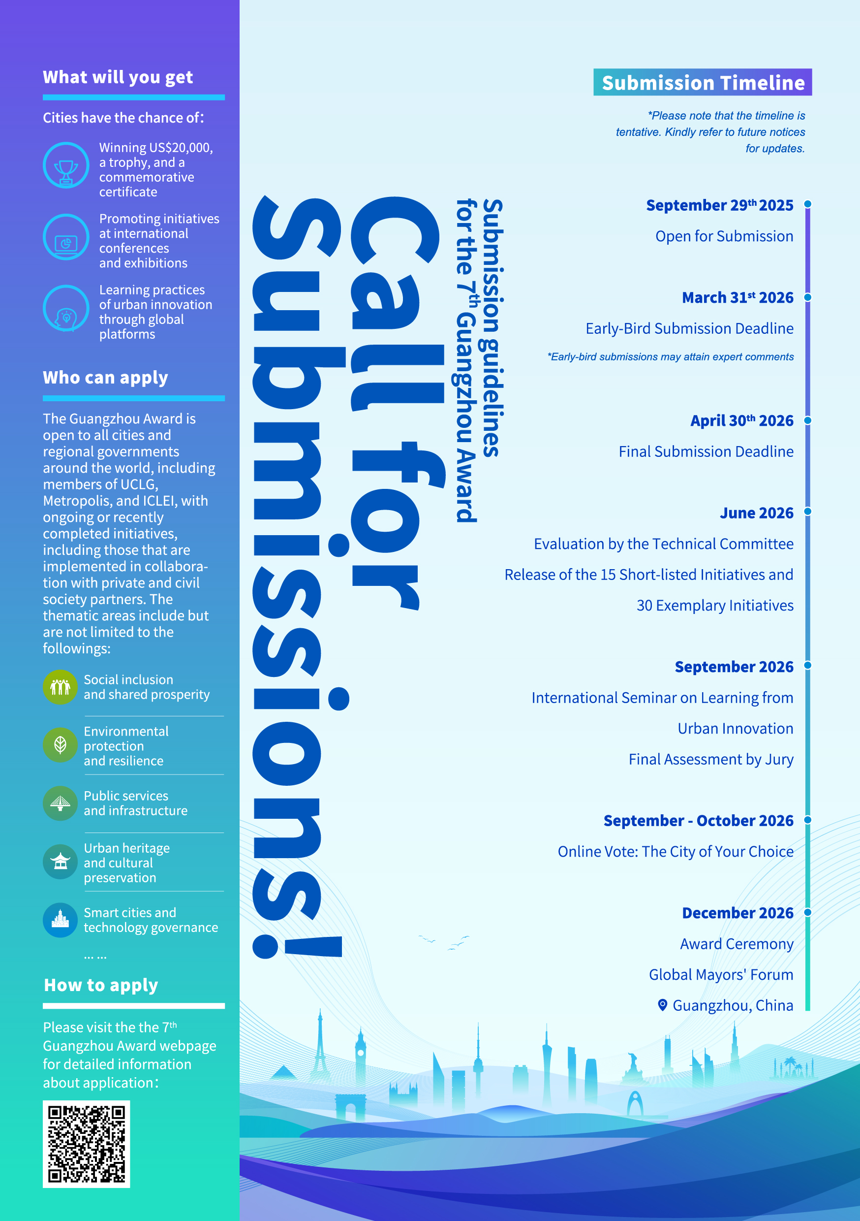 The Guangzhou International Award for Urban Innovation (the Guangzhou Award) is co-sponsored by the City of Guangzhou, the United Cities and Local Governments (UCLG) and the World Association of the Major Metropolises (Metropolis). The aim of the Guangzhou Award is to recognize innovation in improving social, economic, and environmental sustainability and good urban governance in cities and regions and, in so doing, to advance the prosperity and quality of life of their citizens. So far six cycles have been held, attracting over 1,600 initiatives worldwide. It has become a global platform for city-to-city learning and the documentation, dissemination, and analysis of the local implementation of global agendas including SDGs and New Urban Agenda (NUA).