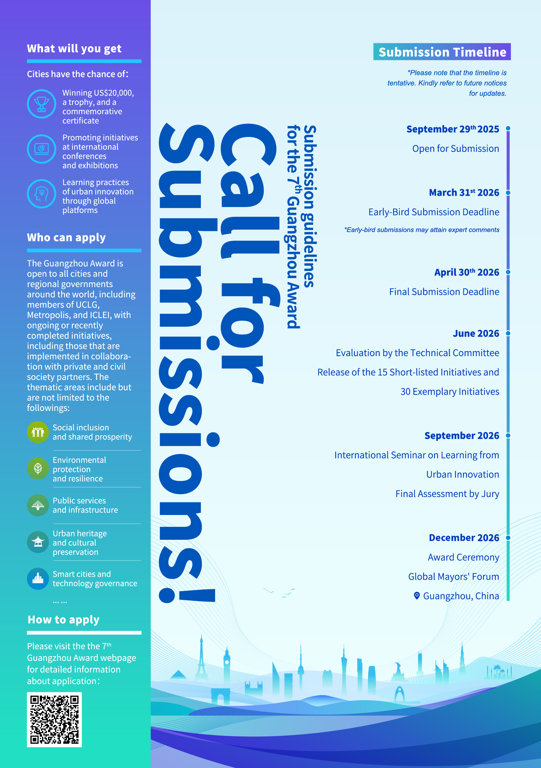 The Guangzhou International Award for Urban Innovation (the Guangzhou Award) is co-sponsored by the City of Guangzhou, the United Cities and Local Governments (UCLG) and the World Association of the Major Metropolises (Metropolis). The aim of the Guangzhou Award is to recognize innovation in improving social, economic, and environmental sustainability and good urban governance in cities and regions and, in so doing, to advance the prosperity and quality of life of their citizens. So far six cycles have been held, attracting over 1,600 initiatives worldwide. It has become a global platform for city-to-city learning and the documentation, dissemination, and analysis of the local implementation of global agendas including SDGs and New Urban Agenda (NUA).